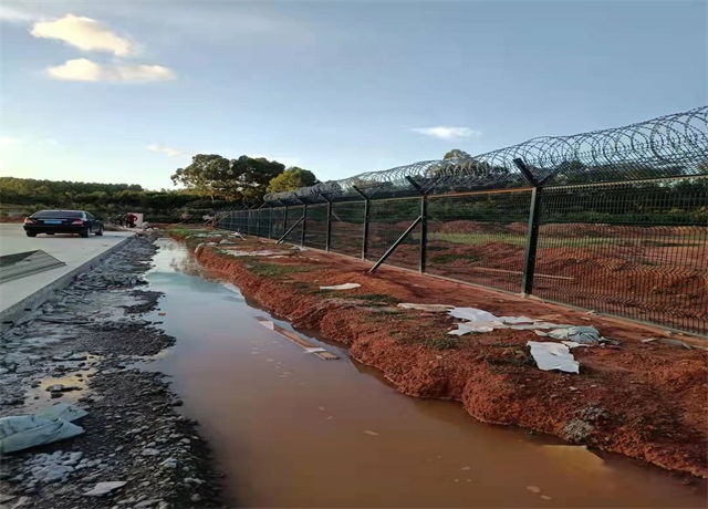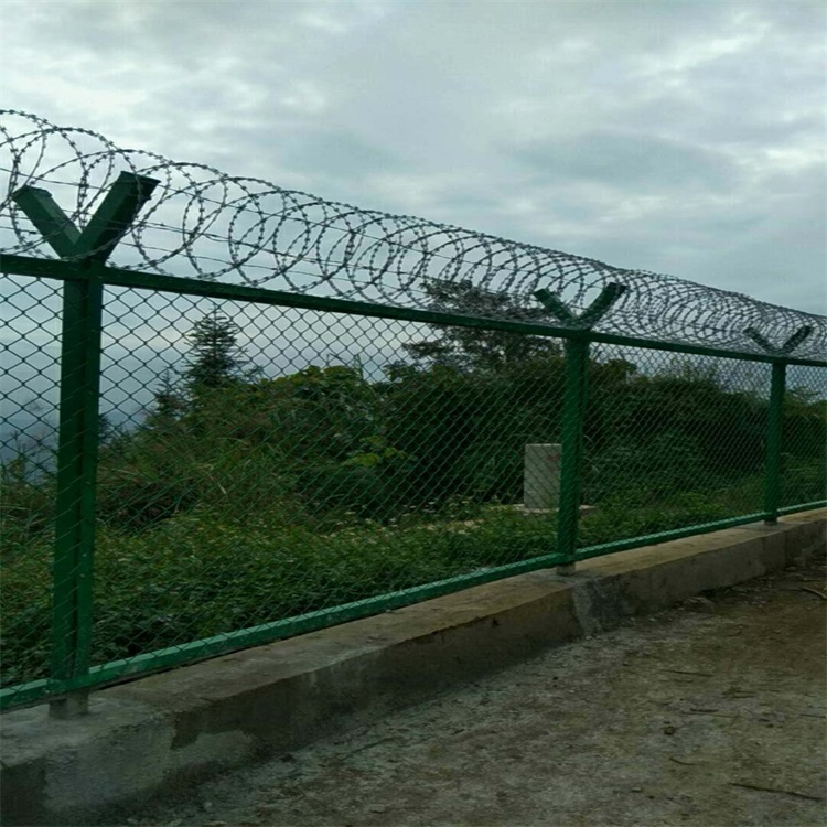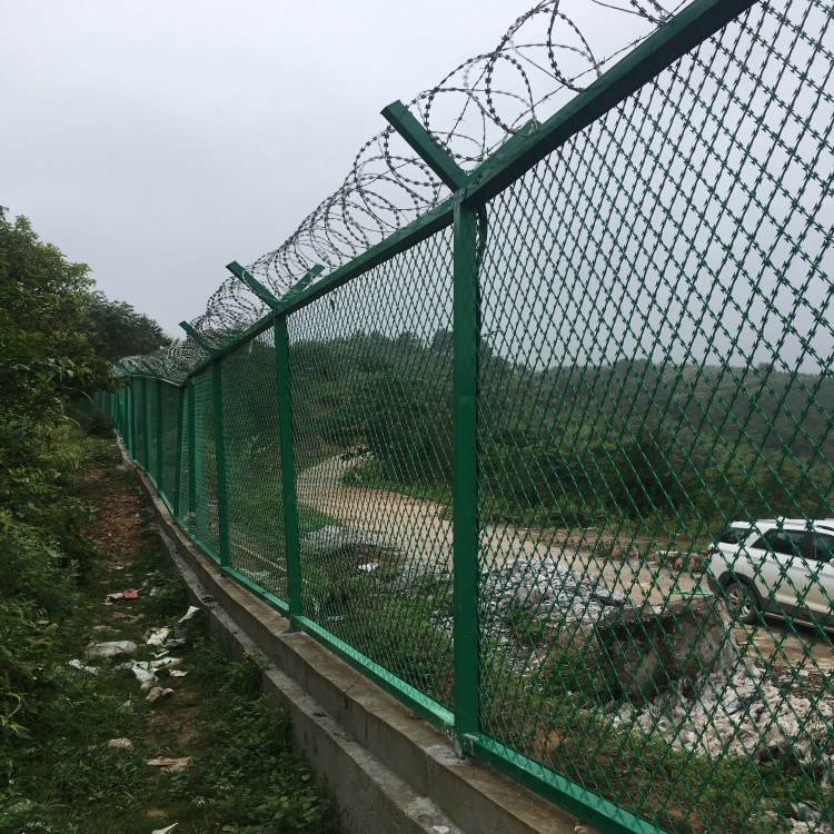 機(jī)場(chǎng)鋼筋圍界就是機(jī)場(chǎng)圍欄網(wǎng)又稱作“Y型安全防御護(hù)欄網(wǎng)”,是由V型支架立柱,加強(qiáng)型焊接片網(wǎng),安全防盜連接件和熱鍍鋅刀片刺籠組成強(qiáng)度和安全防御性級(jí)別很高。近年來(lái),被廣泛應(yīng)用在機(jī)場(chǎng),軍事基地等高安全場(chǎng)所。注:如果在機(jī)場(chǎng)護(hù)欄網(wǎng)頂部加裝刀片刺絲、刀片刺繩后又很好的增強(qiáng)了安全防護(hù)性能。采用電鍍、熱鍍、噴塑、浸塑等防腐形式,具有很好的抗老化、抗曬、耐候等特點(diǎn)。其產(chǎn)品造型美觀、花色多樣,既起到圍欄作用,又起到美化作用。由于具有安全性高、防攀爬能力好,網(wǎng)片連接方式采用特制SBS緊扣件,有效防止人為的破壞性拆卸,橫向四道折彎加強(qiáng)筋,使網(wǎng)面強(qiáng)度顯著增加。
